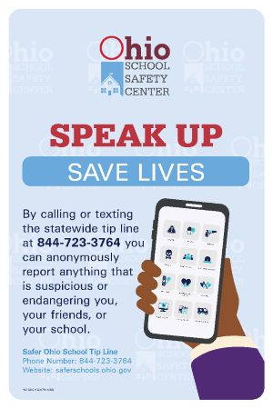 Students and adults can anonymously share information with school officials and law enforcements about threats to student safety via call or text to the Safer Ohio School Tip Line. Calls and texts are answered by Ohio Homeland Security. Students, parents, or staff who wish to report threats anonymously are encouraged to utilize the Tip Line for threats of mass incident or harm to a single student. To utilize this service:
